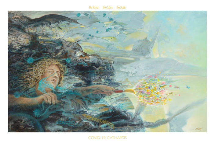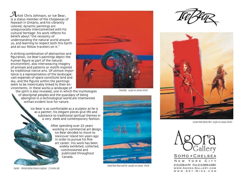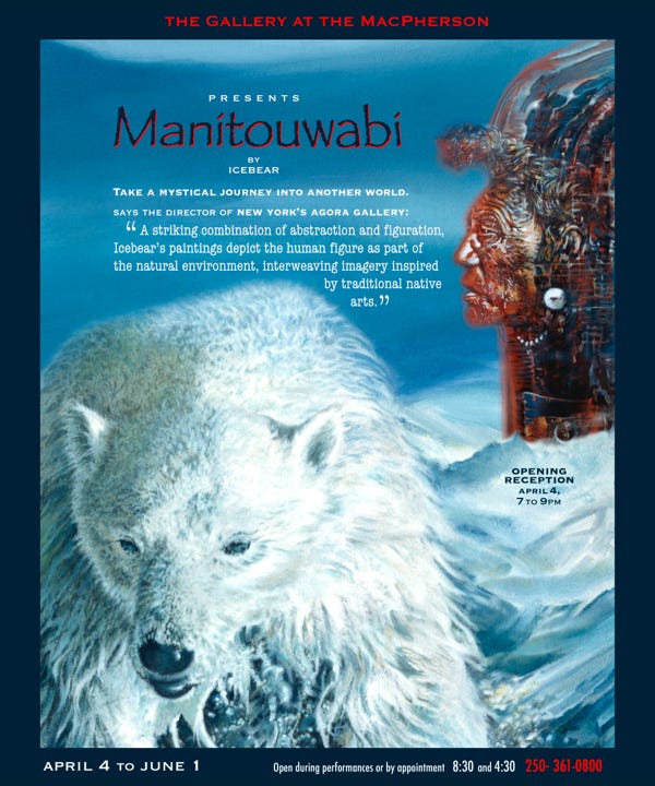 Ice Bear’s fine art has evolved over the past 30 years, from a graphic style that combined the forms and shapes of traditional Ojibway art, to a free flowing technique which provide richly toned paintings that can change colour and depth as sunlight moves, and day turns to night. His many years as art director, and over 5 years as muralist have given him a great interest in technique; how paint ‘works’, colour, brush-strokes, and layering, some IceBear paintings have close to 20 layers of paint and medium.